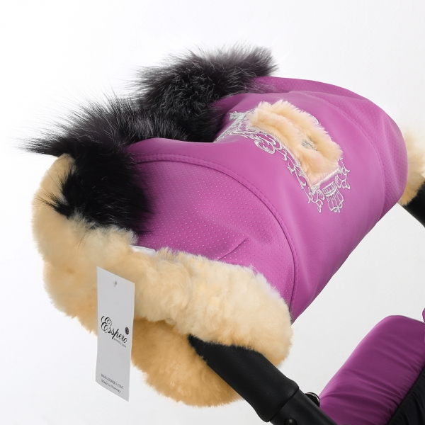 Муфта изготовлена из высококачественных материалов, соответствующих всем санитарным нормам. Верхняя часть выполнена из прочной эко-кожи, не пропускающей ветер и влагу. Внутри – натуральная овечья шерсть с отличными свойствами терморегуляции. На ручку коляски крепится при помощи кнопок. Муфта представлена в большой цветовой гамме с принтом в виде королевских вензелей.
