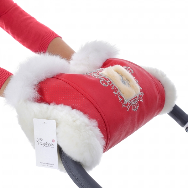 Муфта изготовлена из прочной эко-кожи, которая не пропускает воздух и влагу, и натуральной овечьей шерсти, которая отлично сохраняет тепло внутри даже в самую морозную погоду. На ручку коляски крепится при помощи специальных кнопок. Муфта представлена в большой палитре цветов и декорирована королевскими вензелями.