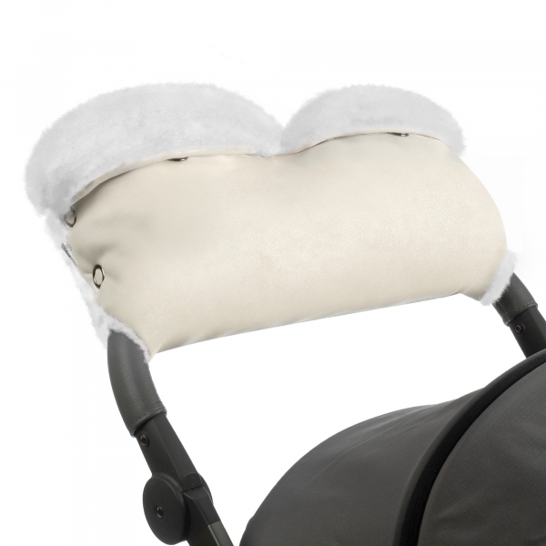 Муфта изготовлена из прочной влагоустойчивой и непродуваемой эко-кожи и натуральной белоснежной овечьей шерсти. Аксессуар надежно крепится на ручку коляски при помощи кнопок. Все материалы гипоаллергенны и безопасны для вашей кожи, соответствуют высшим санитарным нормам. Муфта представлена в приятной цветовой гамме.